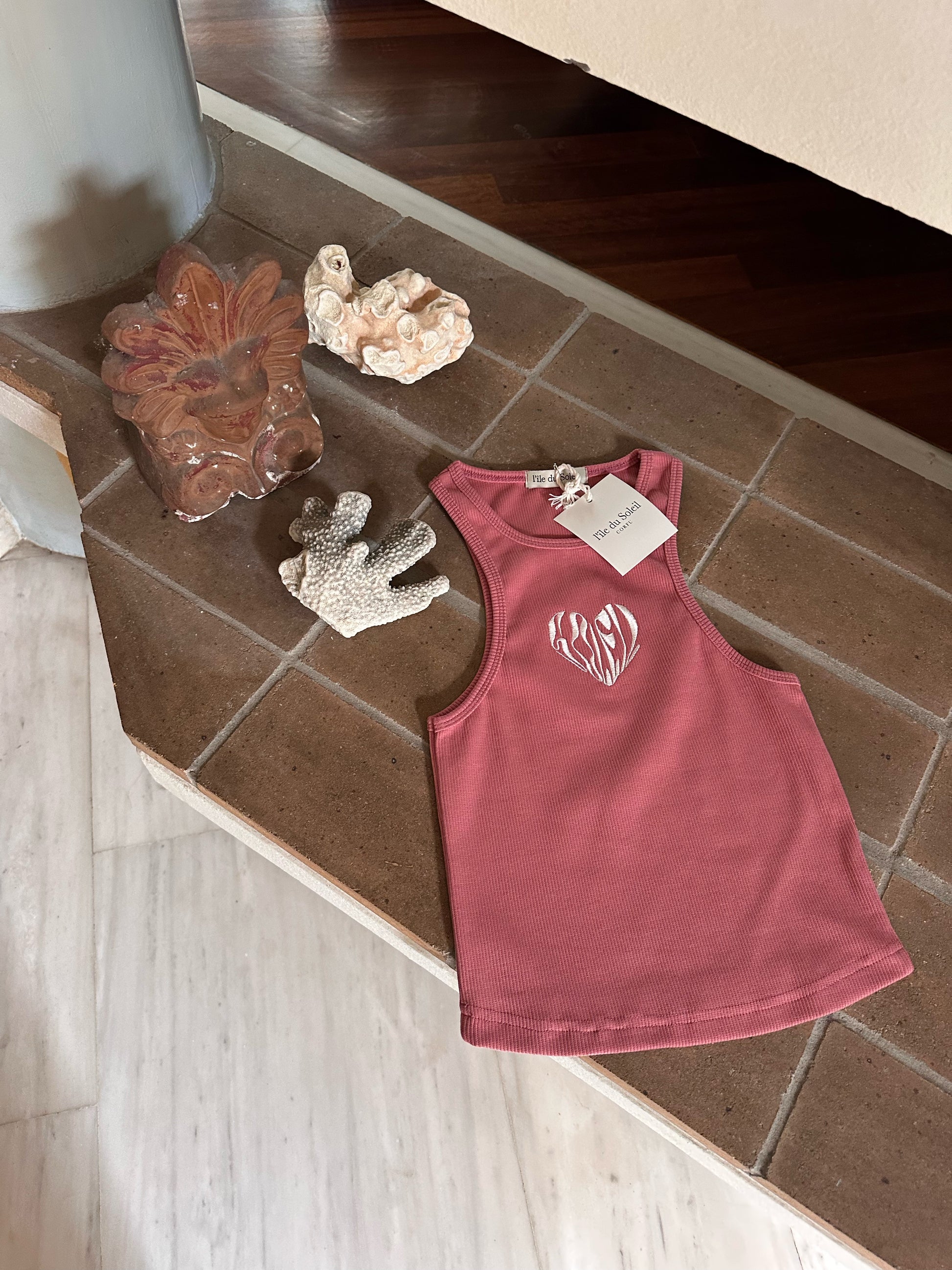 Peach ribbed tank top with white heart embroidery.